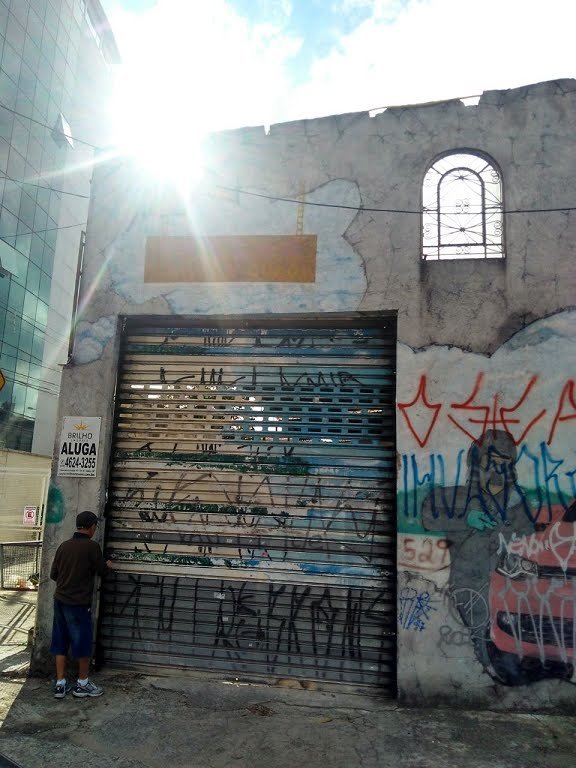 Galpão comercial com 250 m², portão de aço, em condições de uso.