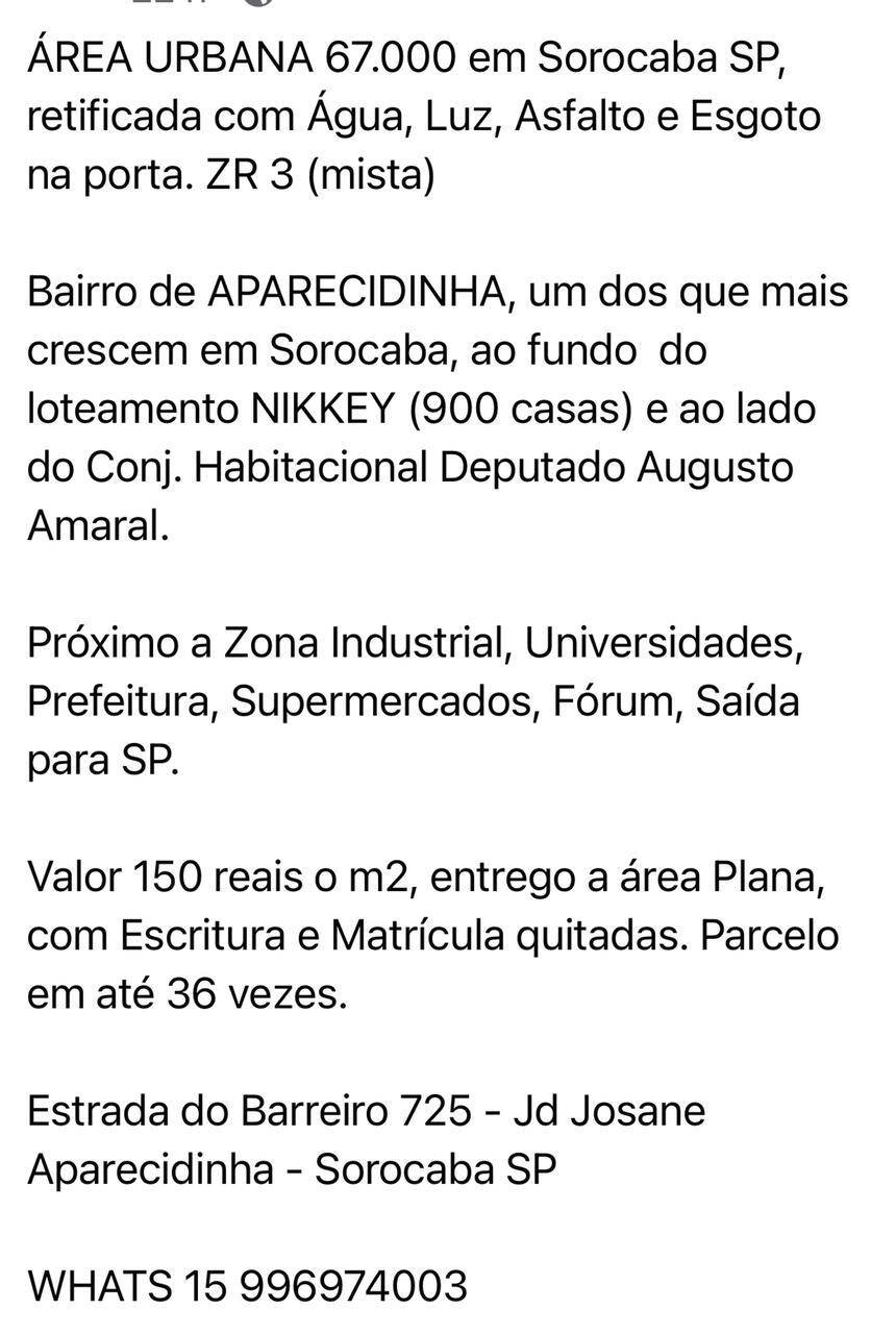 'ÁREA de 67.000 m2, no Bairro de Aparecidinha Jd Josane. (ZR 3 - MISTA). Com solicitações de infraestrutura como água, luz, esgoto e asfalto na porta. Possibilidade de desenvolvimento de 420 apartamentos, considerando 50% da área. Parcela em até 36 vezes. Entrega da área plana.'