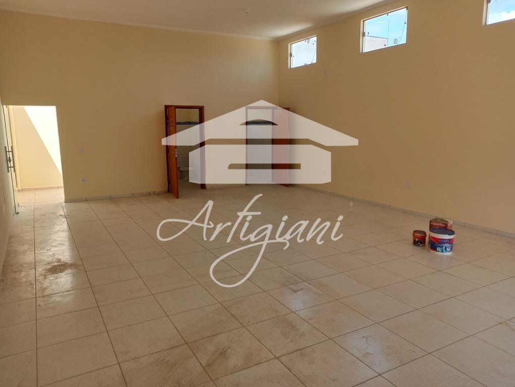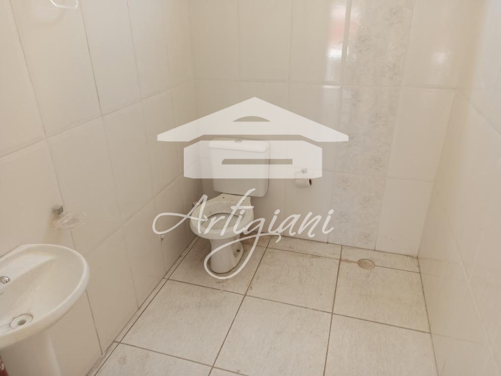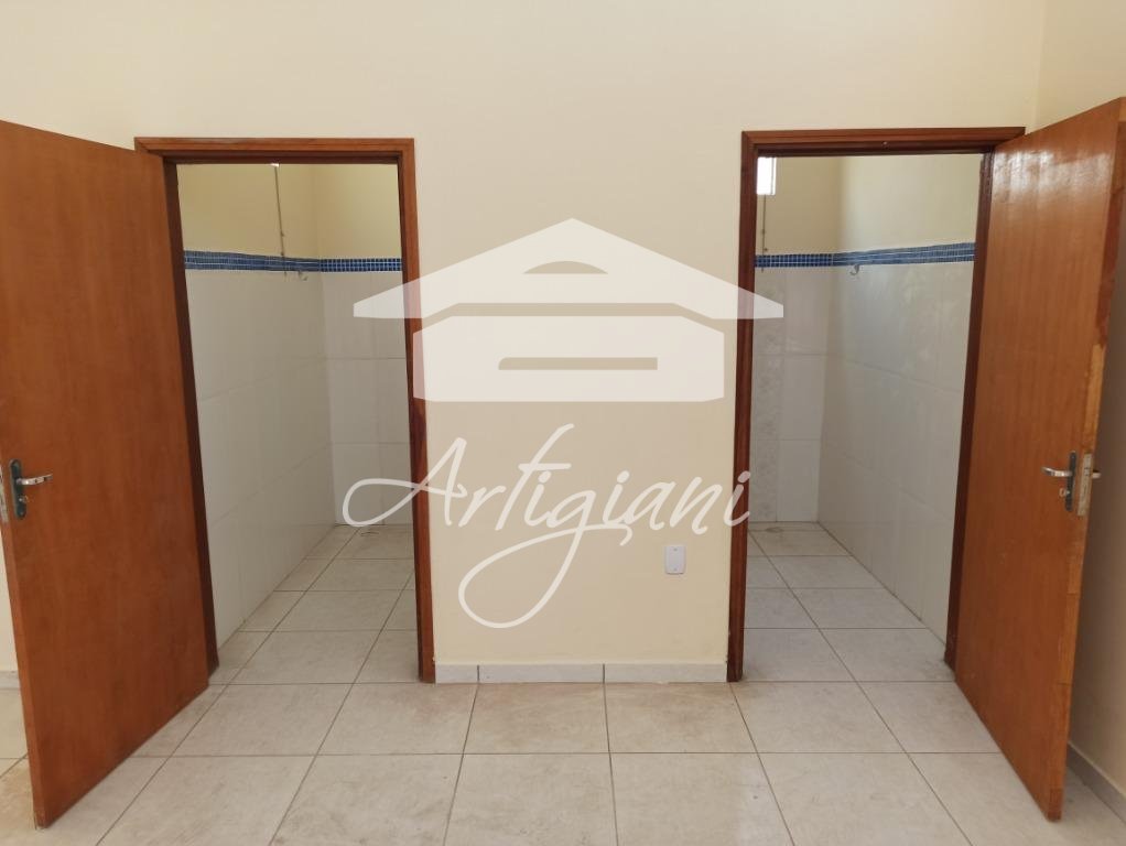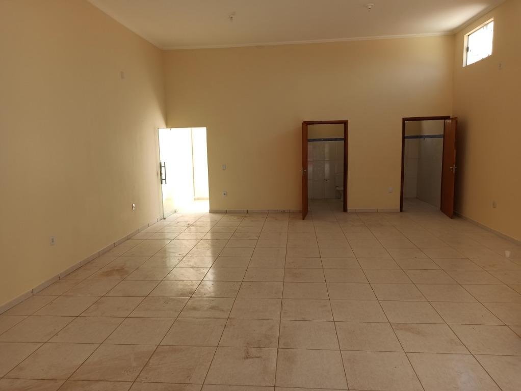 Salão com 80m², 2 banheiros, área de serviço.