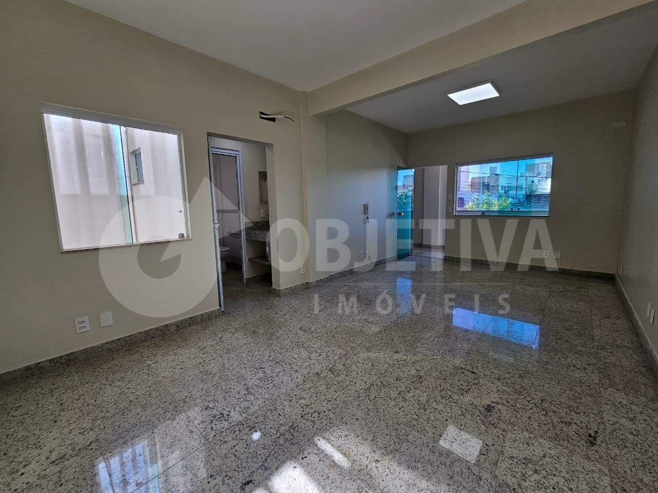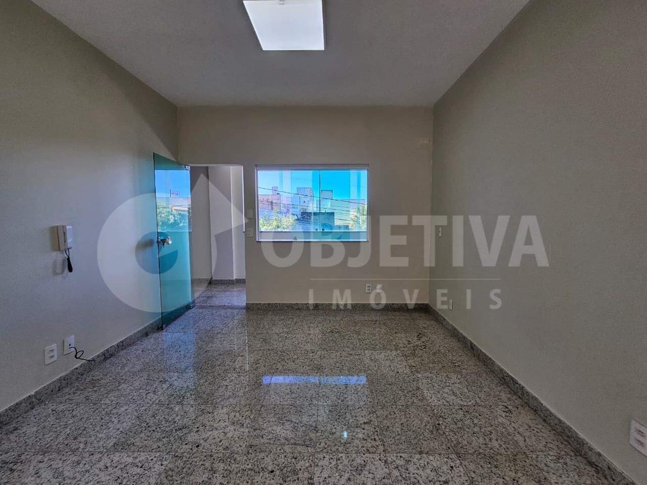 Sala comercial disponível para aluguel no bairro Brasil em Uberlândia, com 26 m² de área privativa, sacada, piso em porcelanato, pintura nova, pia com bancada e banheiro social. O prédio conta com elevador e interfone.