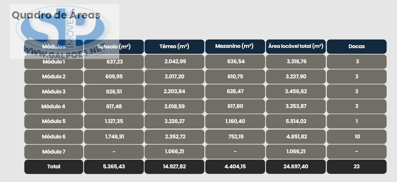 Galpão logístico para locação na Zona Leste, área total 4.851m², armazém 2.352m², mezanino 752m², subsolo 1.746m², pé-direito livre de 12 metros, capacidade do piso 6T/m², distância entre pilares de 23 m x 23 m, cobertura em estrutura metálica e telhas com isolamento termoacústico, ventilação cruzada, sistema de combate a incêndio, iluminação de LED, gerador, o módulo tem 10 docas com plataforma elevada. O empreendimento disponibiliza módulos a partir de 1.000m² a 5.500m². Agende uma visita.