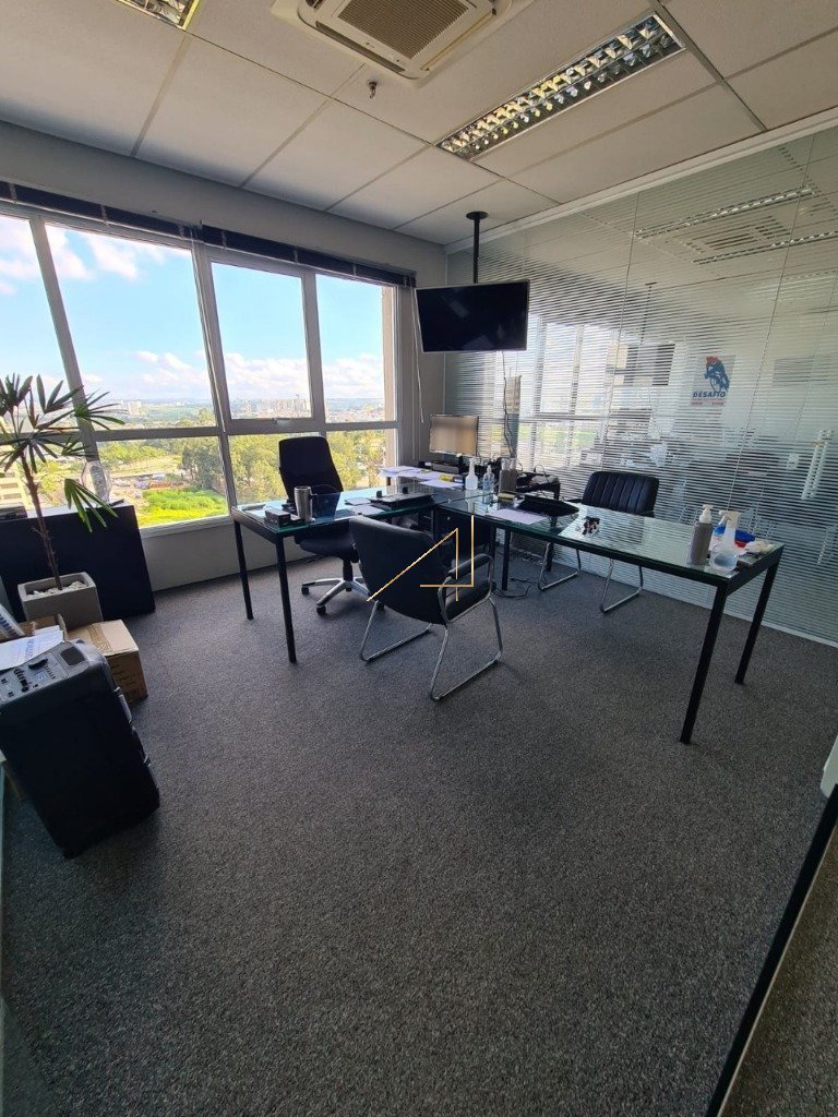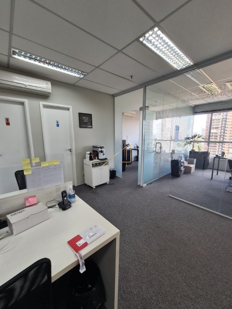 Sala comercial conjugada, empreendimento, sendo cada sala com 55,77 m² e área total de 111,54 m², incluindo uma vaga na garagem para cada sala (total 2 vagas). A sala está toda equipada com ar-condicionado, infraestrutura para telefonia, internet e iluminação. Piso em carpete cinza, três banheiros, quatro salas individuais separadas por vidro, totalmente mobiliadas, com aparelhos de TV para reuniões, mesas conjugadas, com película de acrílico, que oferece total discrição e privacidade e atende as normas de segurança e protocolos de saúde, a sala ainda dispõe de recepção e copa. A locação ou a venda deve ser feita preferencialmente porteira fechada, com todos os móveis e sem a individualização das salas.